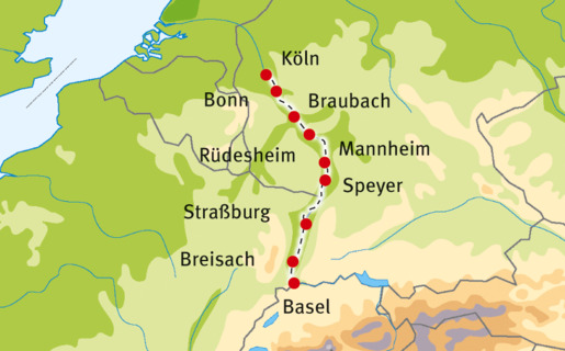 1 Anreise & Einschiffung. Köln. AB 15 Uhr. Bonn. AN 19 Uhr. Anreise im Komfortbus nach Köln und Einschiffung. Am Nachmittag gleitet Ihr Schiff rheinabwärts in Richtung Bonn. Am Abend erreichen Sie die ehemalige Bundeshauptstadt. Vielleicht lockt Sie ein Spaziergang entlang des Rheinufers, wenn sich das Licht sanft im Wasser spiegelt? Oder Sie schlendern durch die charmante Altstadt – Beethoven lässt grüßen. Ein gelungener Auftakt für eine Reise voller landschaftlicher und kultureller Höhepunkte.
